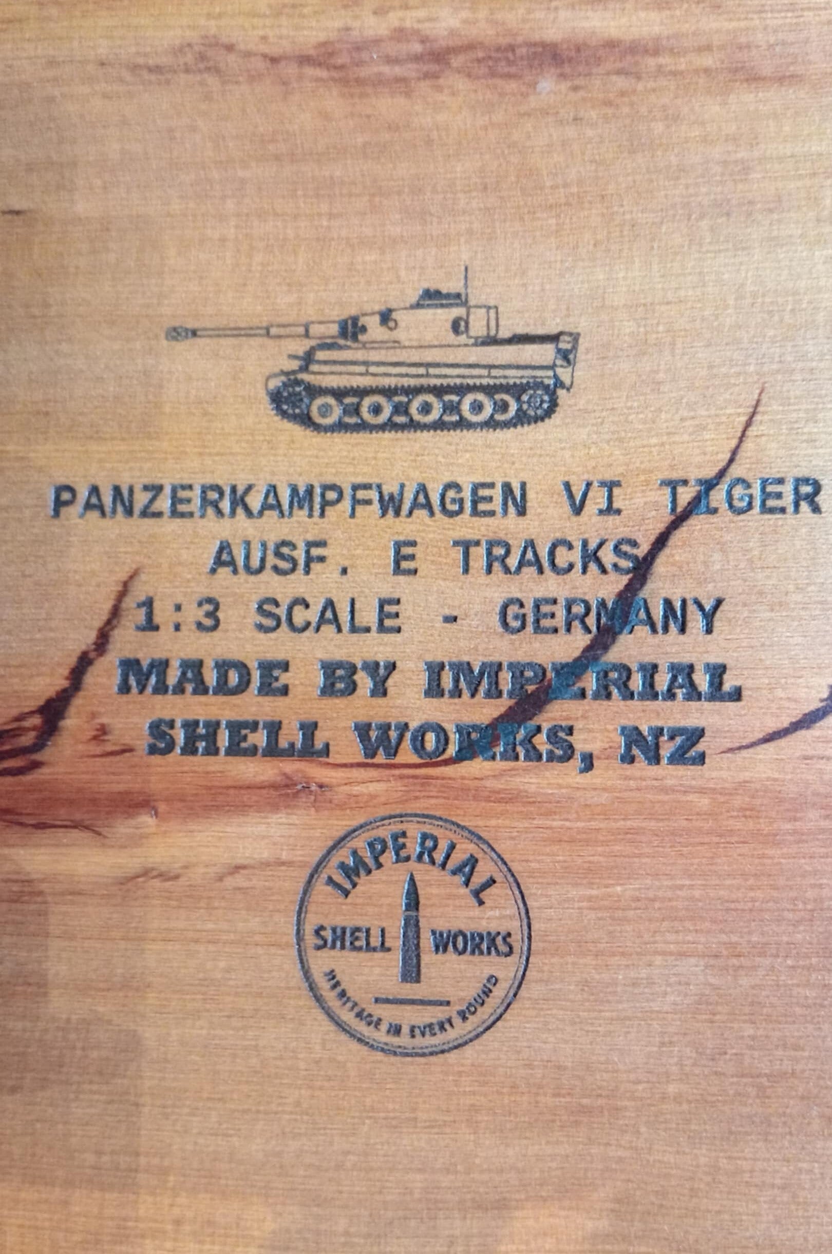 Here we’ve recreated a section of its formidable tracks at 1:3 scale, mounted on a solid Rimu plinth. Heavy-duty timber, engraved with our Imperial Shell Works mark and the silhouette of the Tiger itself. Each set of links is 3D printed with interlocking detail, then hand-finished and waxed for a professional display.