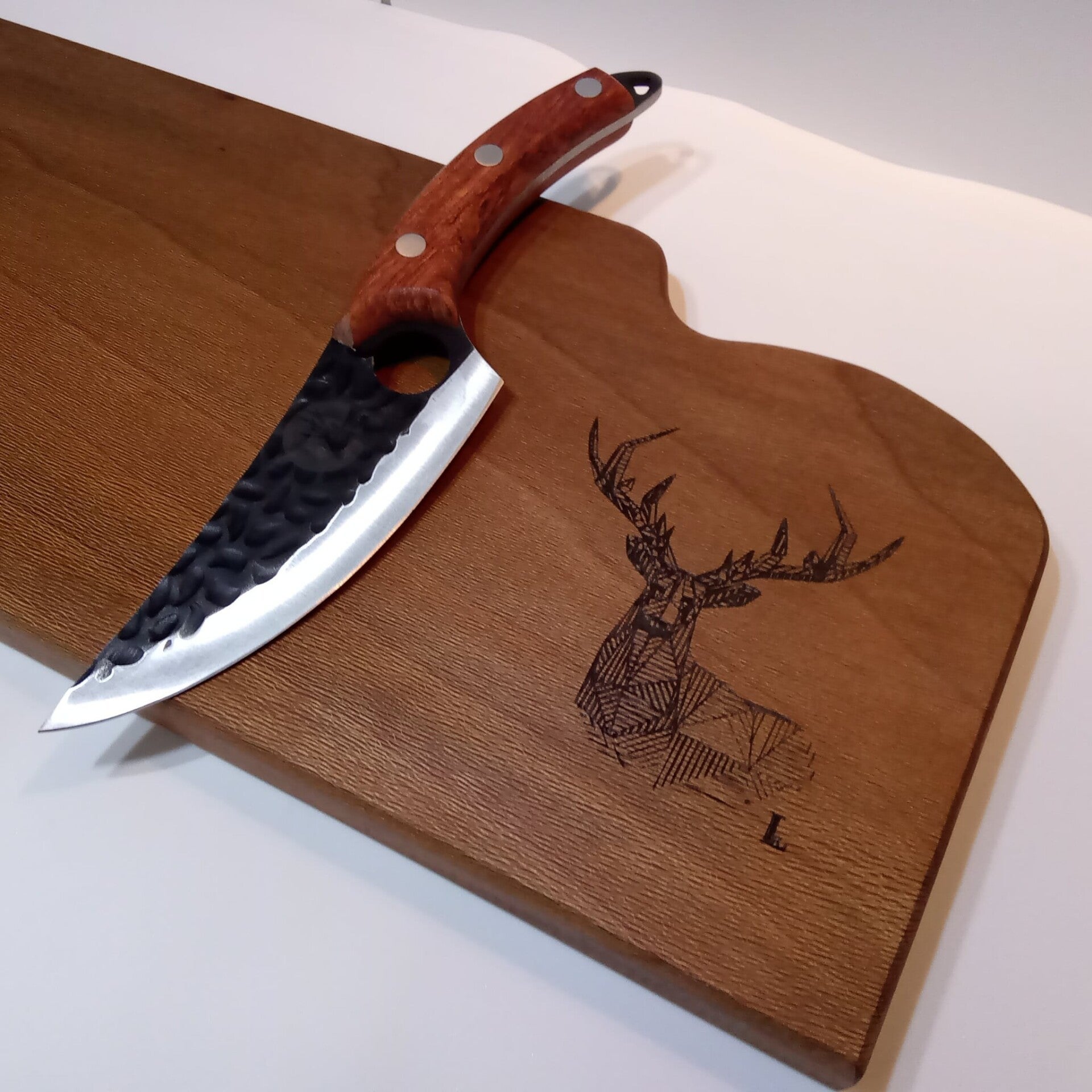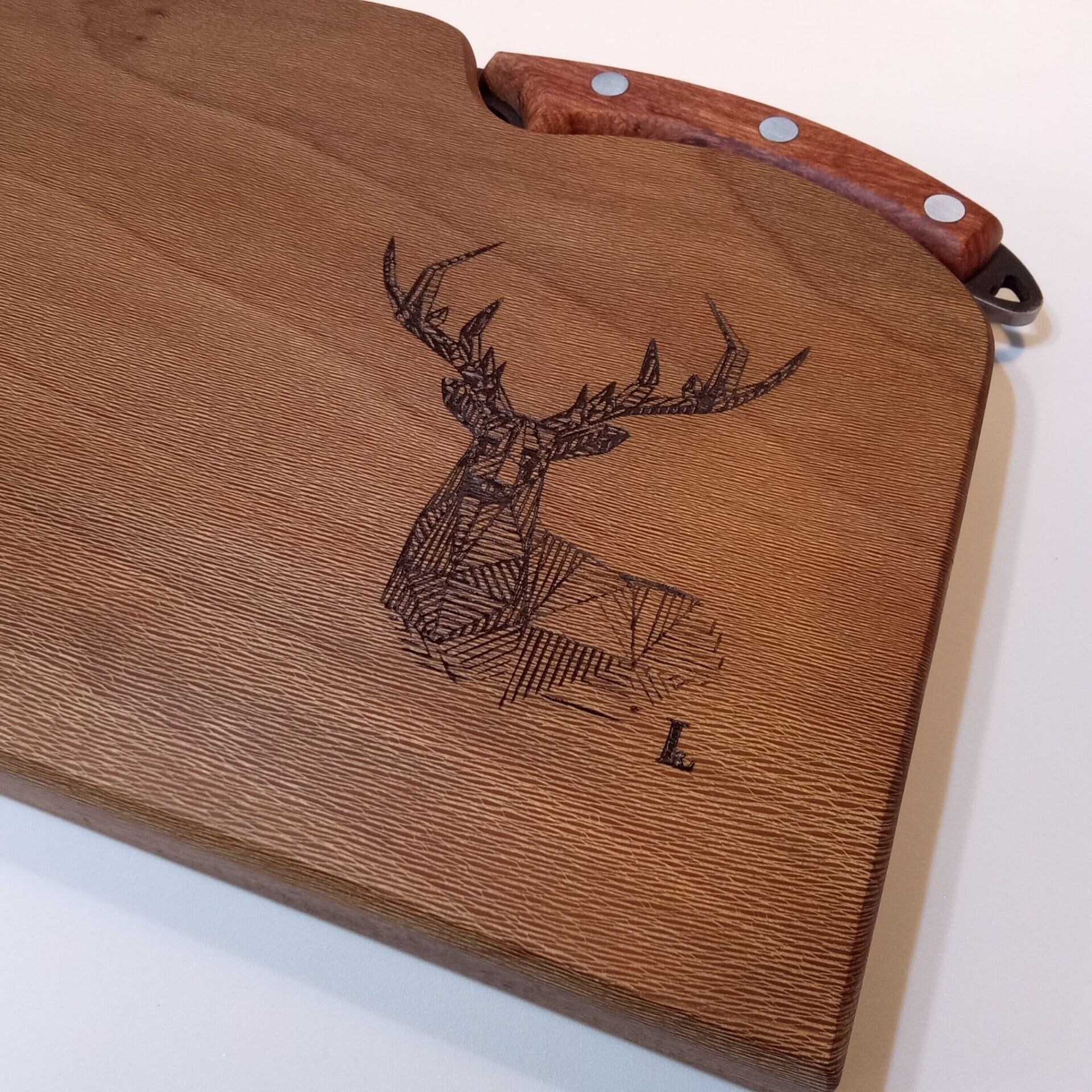 The Lyford Rustic Board & Knife Set is a one-of-a-kind handcrafted piece, made from Mt Lyford spruce timber and engraved with a bold geometric stag motif. A forged-style knife rests neatly in the top recess of the board, held securely by concealed magnets. (Knife not made by MGW.)